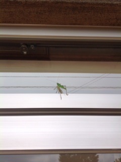 窓の枠からバッタが